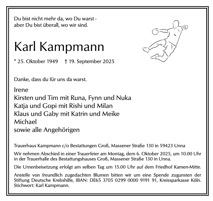 Die Handballer des TuS Westfalia Kamen trauern um Karl Kampmann, der am 19.09.2025 im Alter von 75 nach kurzer schwerer Krankheit verstorben ist.
